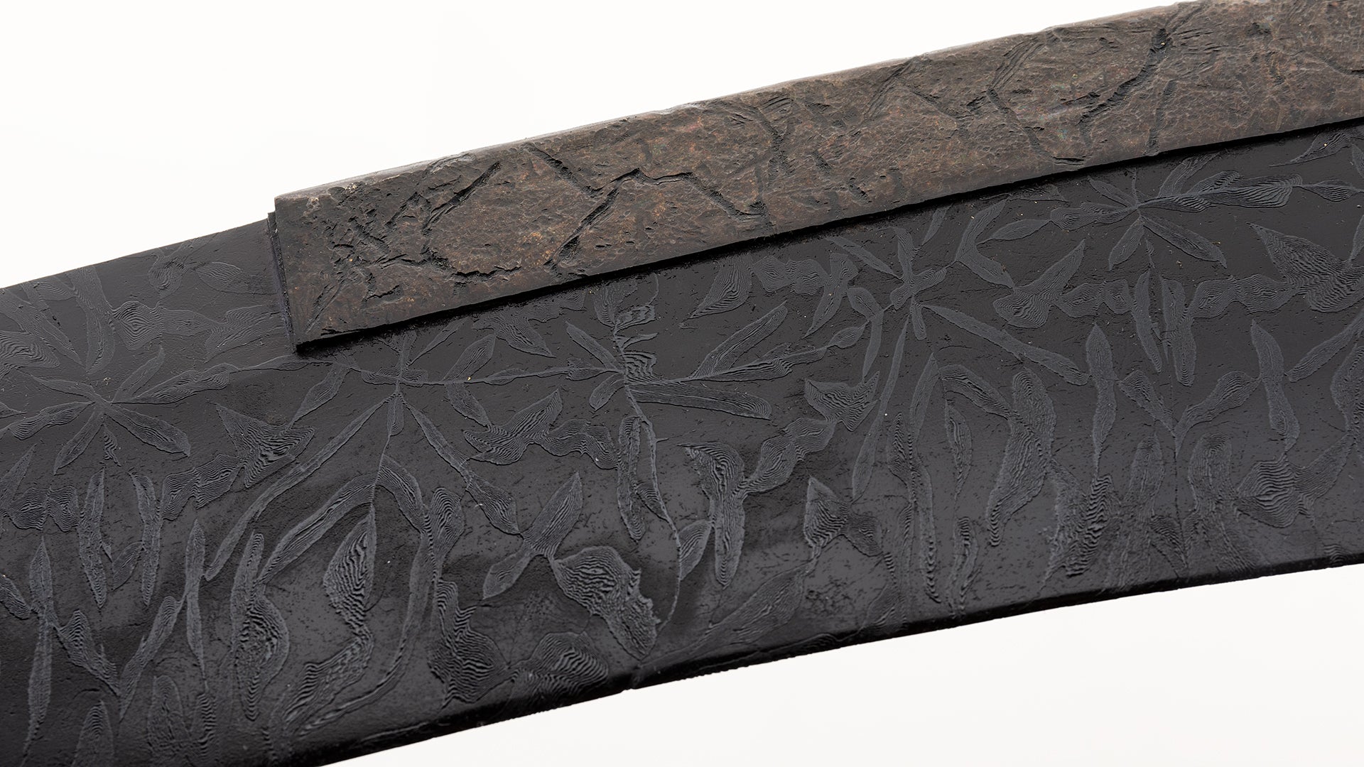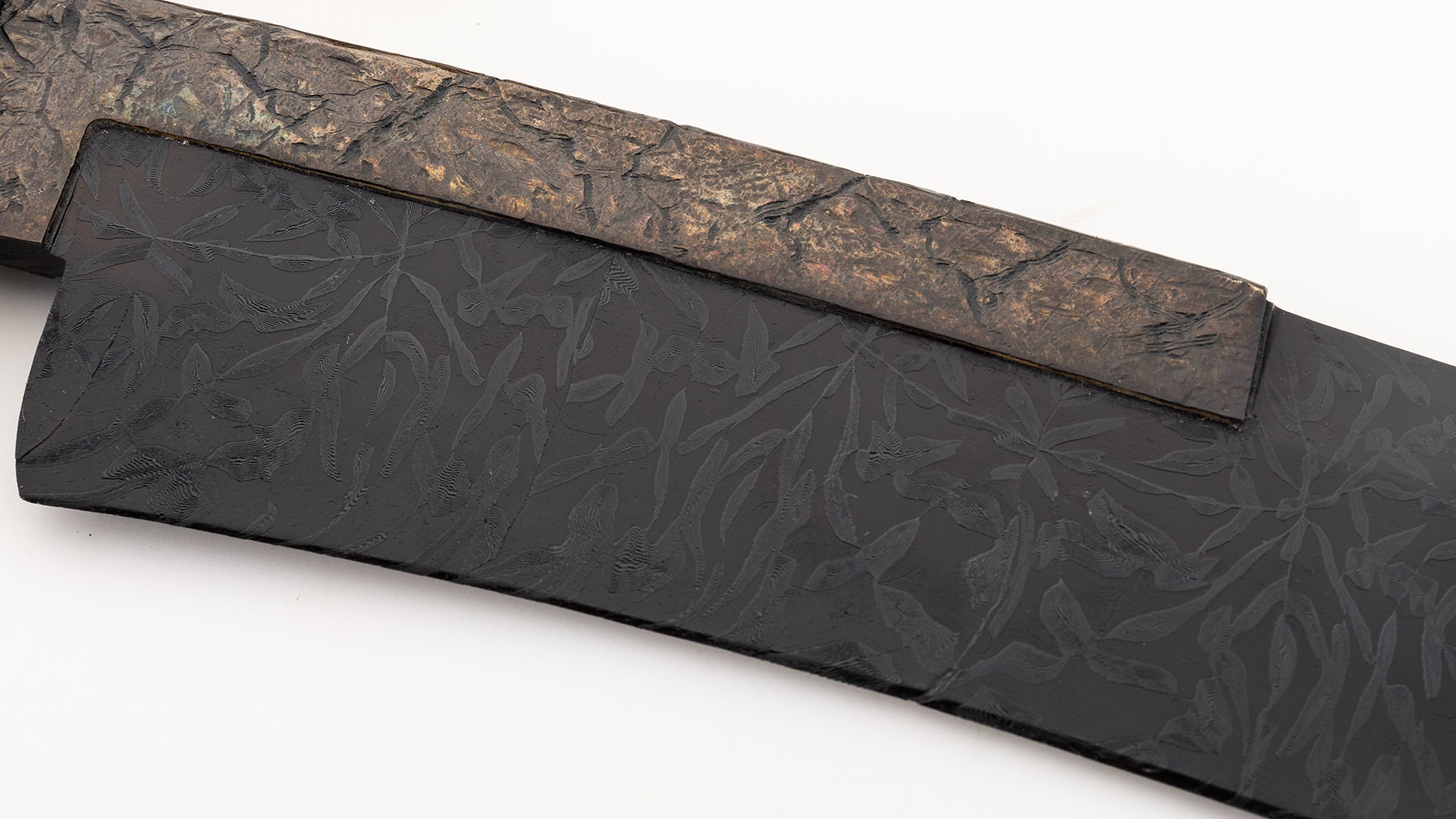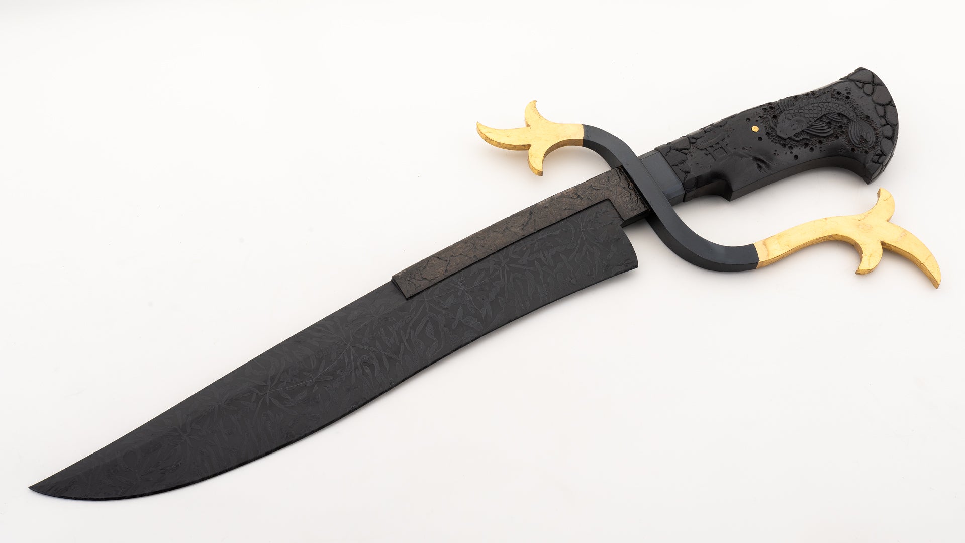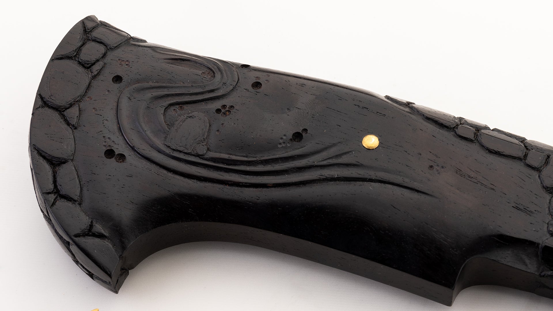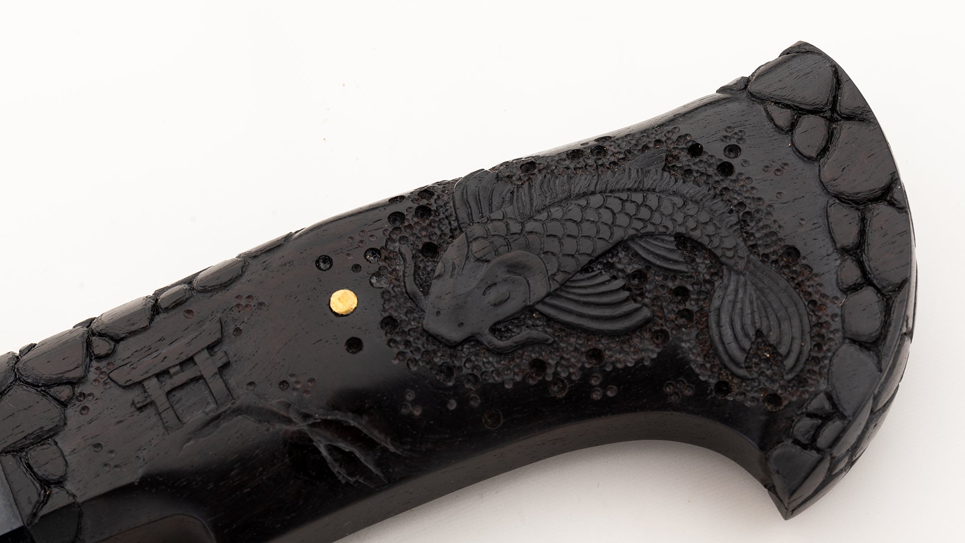 - A Handle of Blackwood and Carp: The handle, crafted from ebony blackwood, is a study in contrasts. Its smooth, polished surface is juxtaposed with the rough texture of the carved carp, which seems to swim through the wood. The carp's scales, meticulously rendered in delicate carving, to bring the fish alive. A Gold pin secures the handle to the tang, completing the harmonious balance of materials and textures.