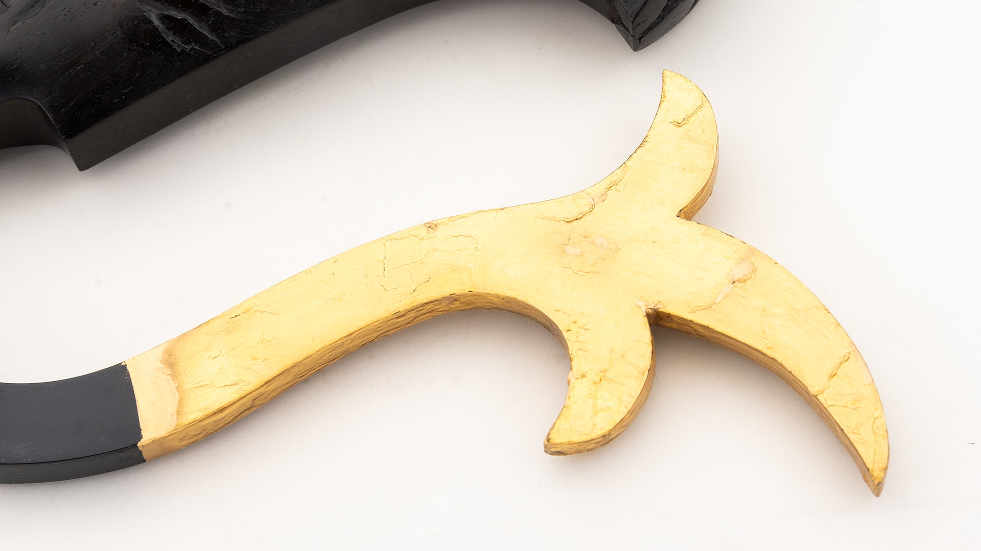 - Guard and Handle: Signature S Shape Guard Gold Tipped with an Elegantly Carved Carp into Black Wood.