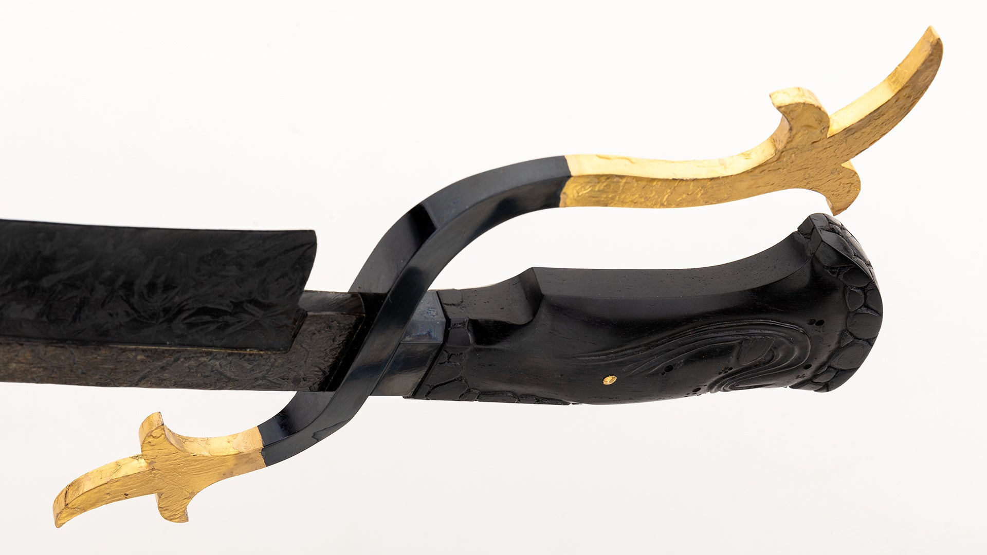 - A Guard of Golden Weeds: The iconic S-shaped guard, another hallmark of Paul's work, echoes the sinuous lines of the seaweed Damascus. The guard's ends, coated in rich gold, create a striking contrast against the dark steel, highlighting the intricate details of the carved weeds.