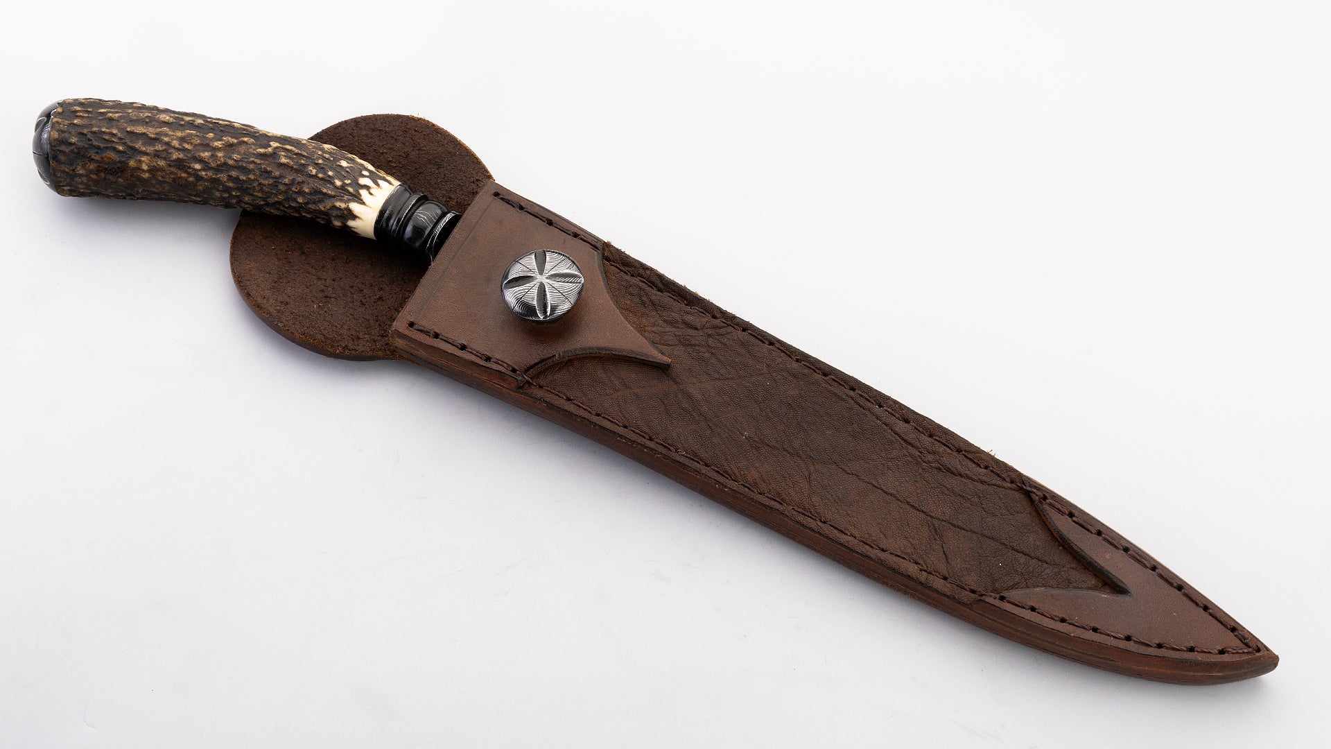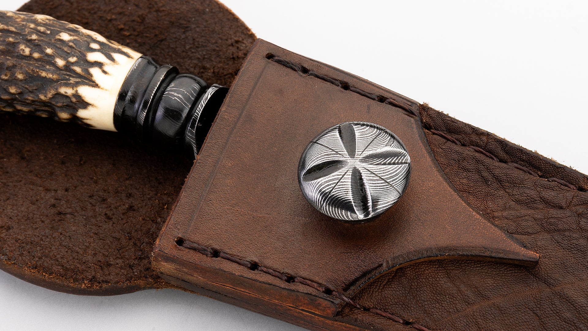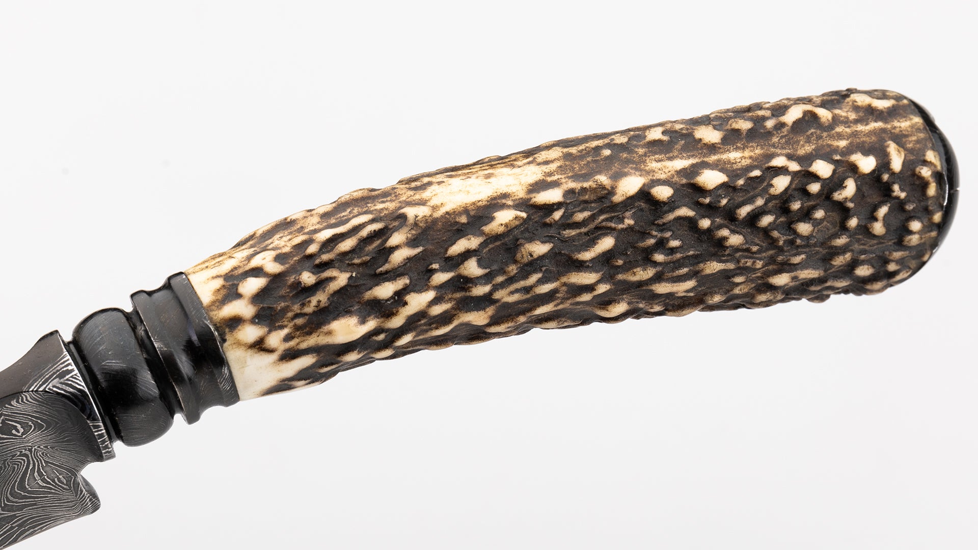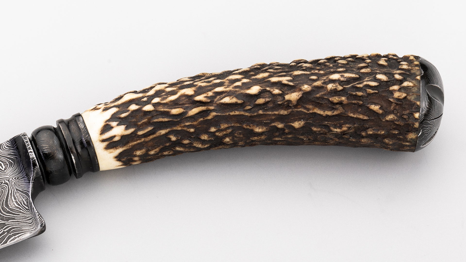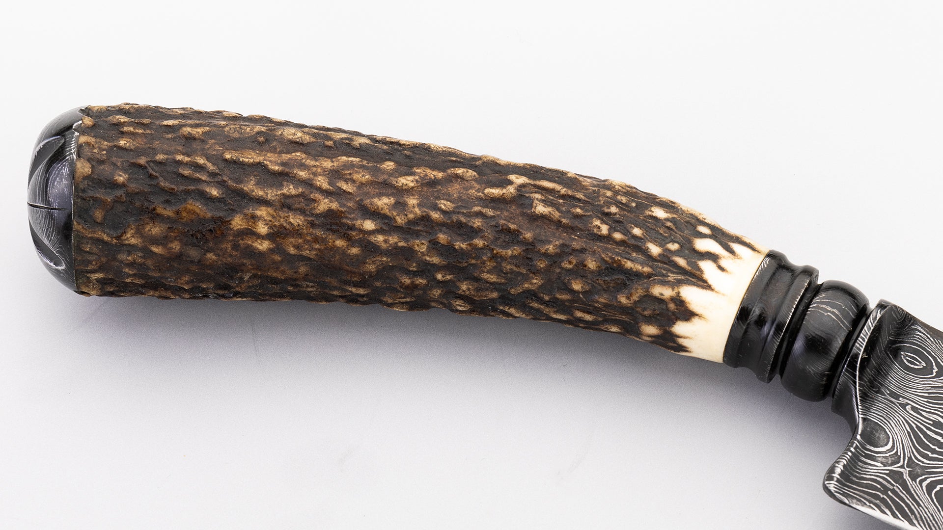 - Stag Antler Handle with Damascus Tail Iron: The handle, crafted from collector grade stag antler, offers a comfortable and secure grip. The delicate Damascus pattern on the rear iron adds a touch of elegance, complementing the blade's intricate design.