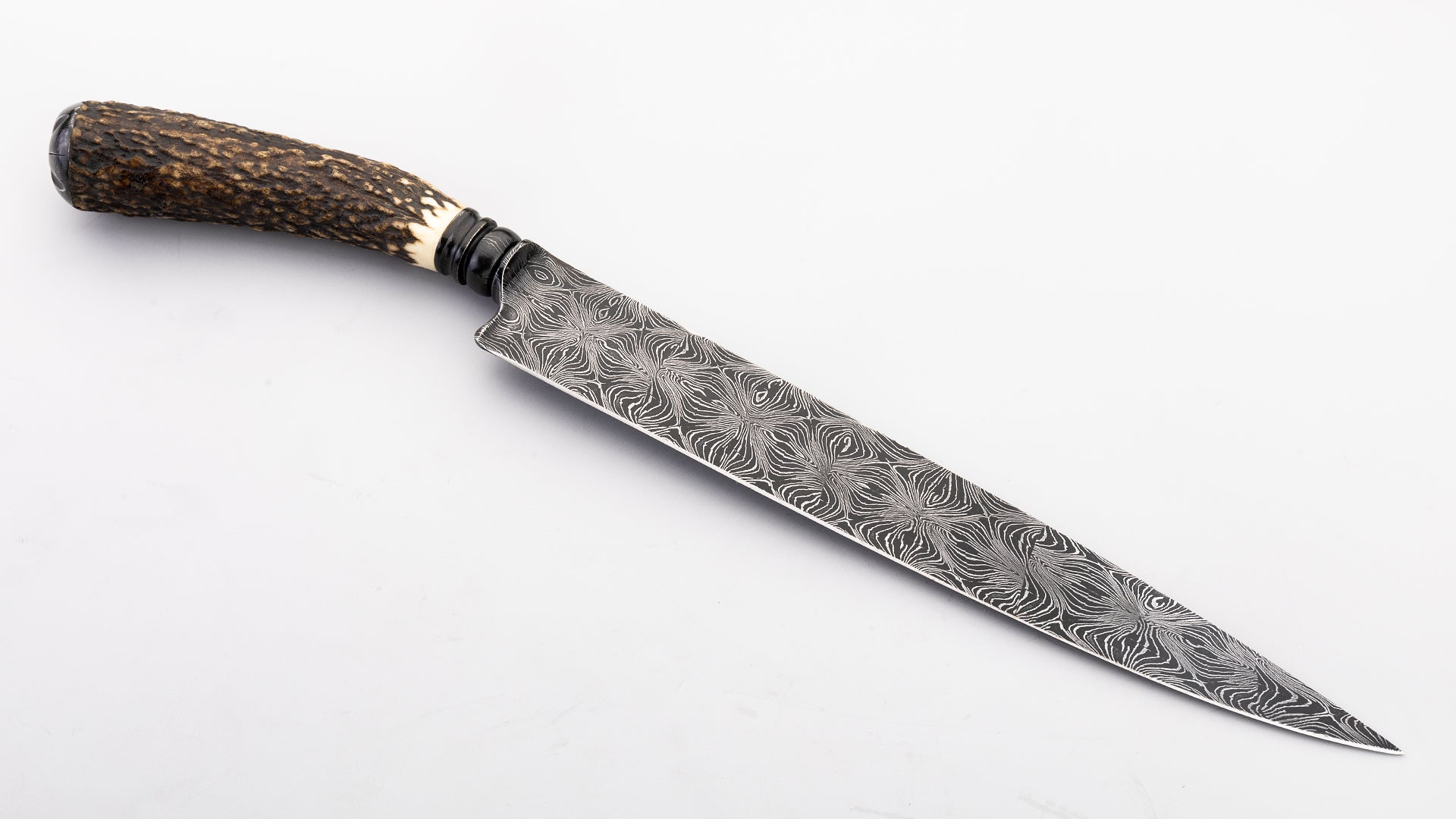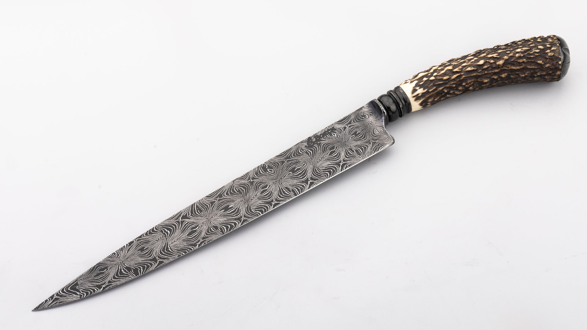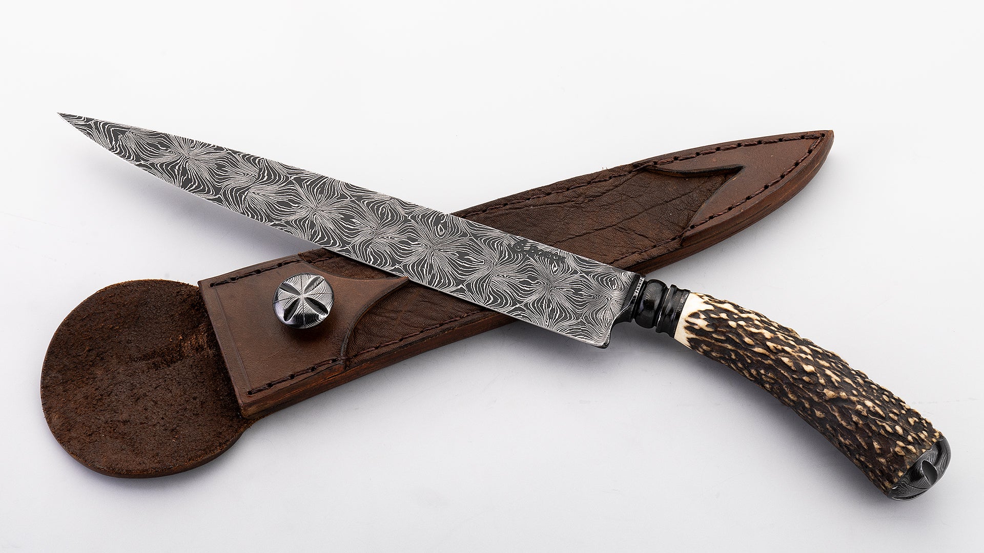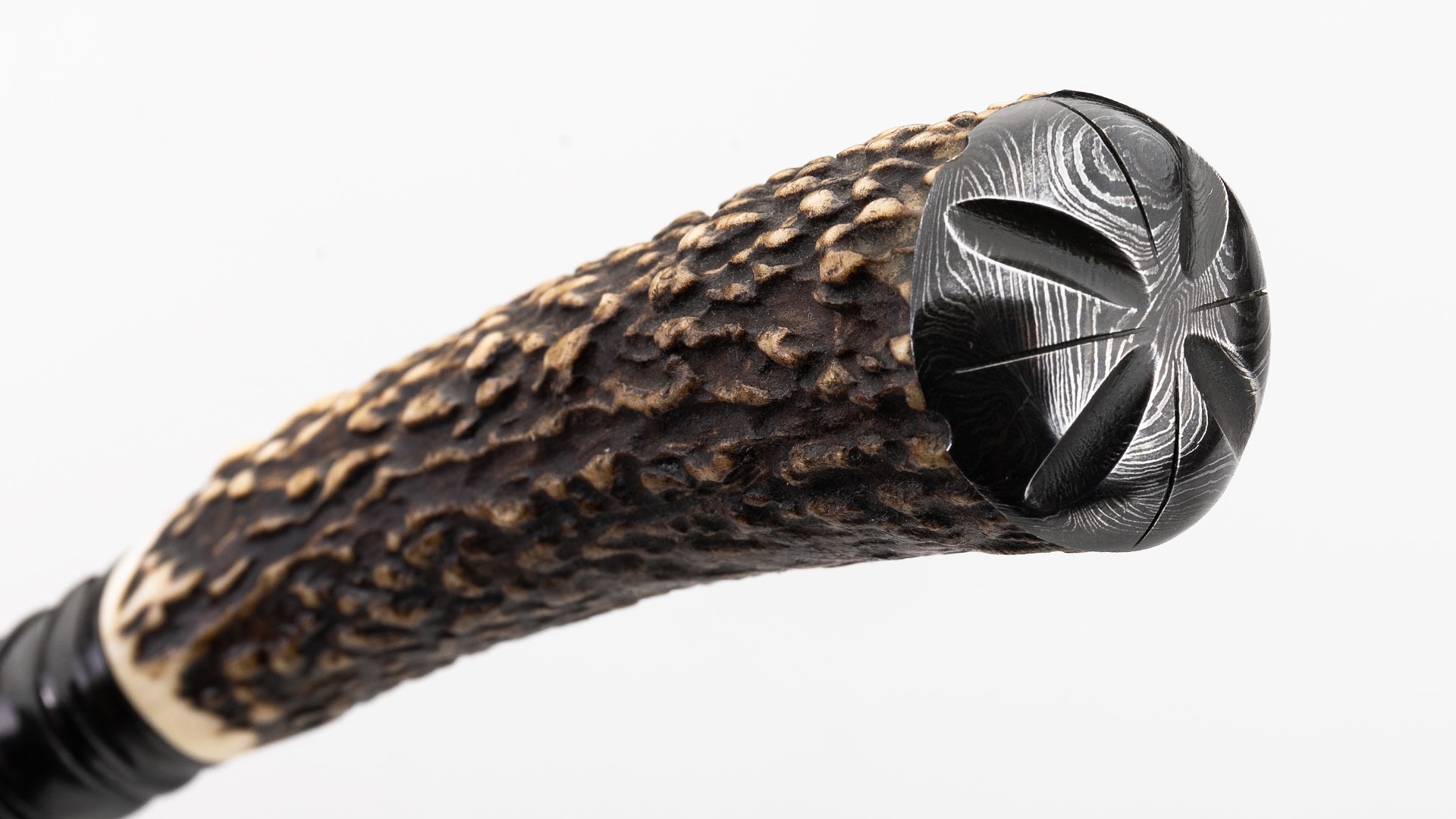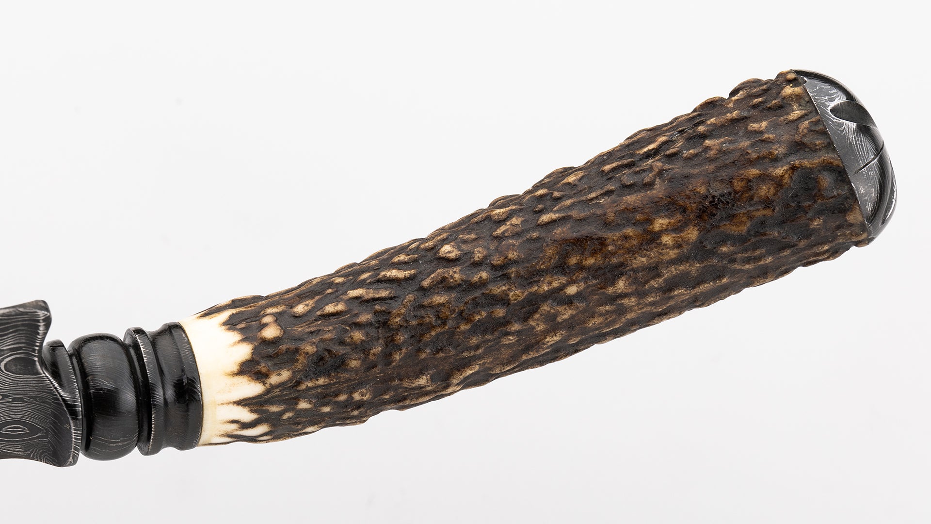 - Guard and Handle: Collector Quality Stag Antler with Integral Bolster and Carved Damascus Fittings.